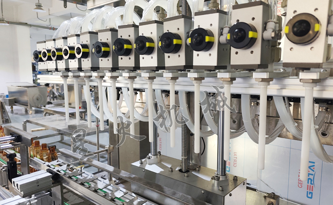腐蝕性農藥灌裝機采用下潛式灌裝頭,從容器內部開始灌裝,降低泡沫產生,支持多瓶型兼容。