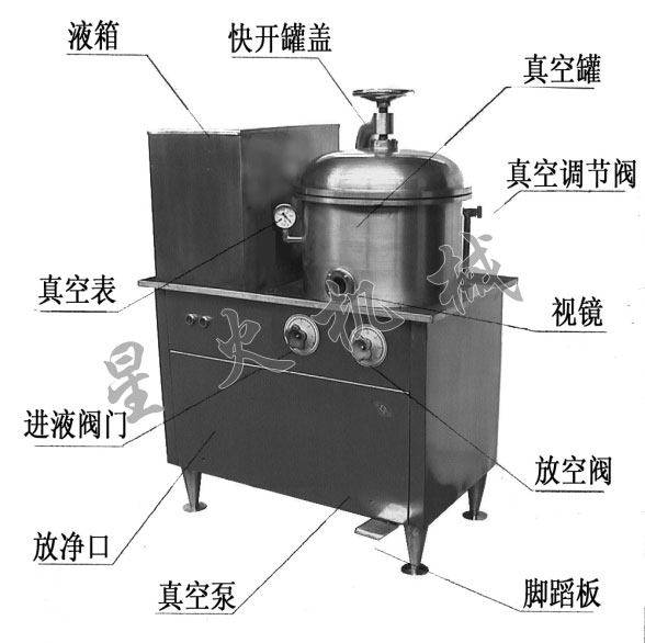 醫用液體真空灌裝機械的組成部件:液相、快開罐蓋、真空罐、真空調節閥、真空表、視鏡、進液閥門、放空閥、放凈口、真空泵、腳踏板。