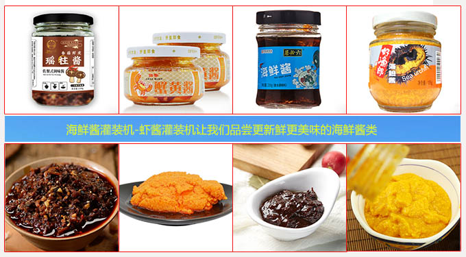 海鮮醬灌裝機/全自動海鮮醬灌裝機廣泛適用于海膽醬、蝦醬、海鮮醬、魚子醬、麻蝦醬、章魚醬、黃豆醬、甜面醬、烤鴨醬、蒜蓉醬、沙拉醬、番茄醬、墨魚醬、瑤柱醬、蟹黃醬、鲅魚醬等顆粒醬類產(chǎn)品灌裝。