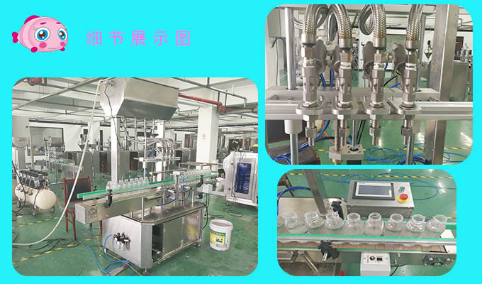 2、全自動農藥灌裝機具有四個灌裝頭,同步灌裝,生產效率高。