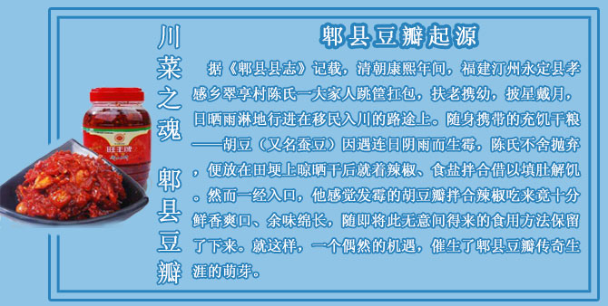 郫縣豆瓣始源于清康熙年間(公元1688年),在“湖廣填四川”的移民大潮中,福建省汀州永定縣孝感鄉翠享村人陳逸仙攜家人遷居郫縣,因其在入蜀途中,隨身攜帶用以充饑的蠶豆偶遇連日陰雨而生霉,不忍棄,遂置于田埂晾曬后,以鮮辣椒剁碎后拌和腌制,用于佐餐而食,竟鮮美無比,遂美其名曰“辣子豆瓣”,送街坊品嘗,深受贊譽,后遂專心加工此“辣子豆瓣”售賣,兼為謀生之計,此為郫縣豆瓣之雛形。