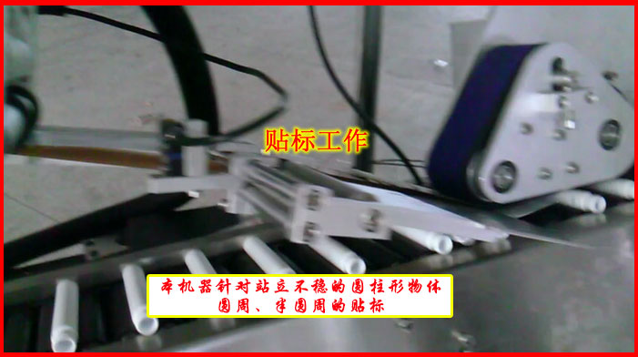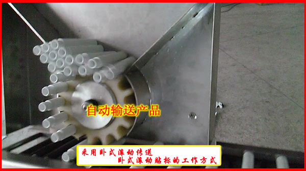 工作流程:人工把產(chǎn)品統(tǒng)一方向送至送料器----送料器自動(dòng)輸送產(chǎn)品進(jìn)入輥筒鏈條輸送帶上----電眼檢測(cè)貼標(biāo)工作-----產(chǎn)品旋轉(zhuǎn)貼標(biāo)加固-----成品輸出。