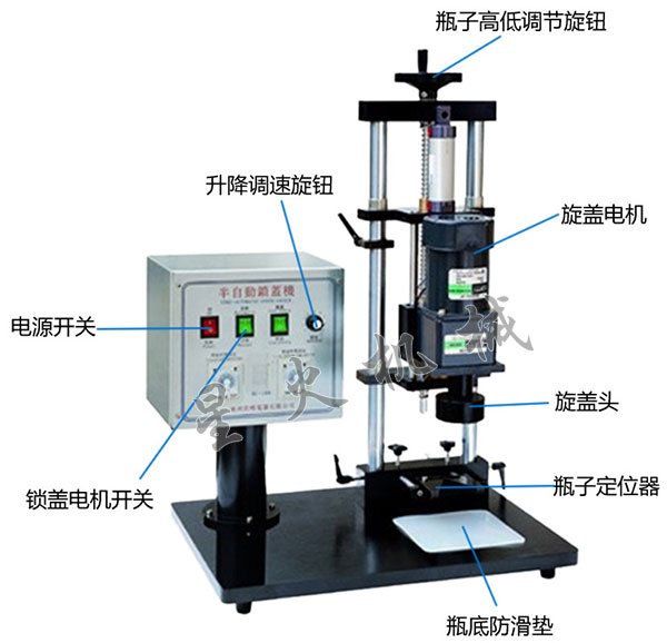 臺式旋蓋機由旋蓋機、旋蓋頭、多檔變壓器三部分組成,便于隨身攜帶。工作時,旋蓋頭罩在瓶蓋上方,旋蓋頭與旋蓋機相連,按動開關,旋蓋頭旋轉,稍向下用力,0.3-0.5秒鐘即可將瓶蓋旋緊。若把機器配上自動輸送裝置,該旋蓋機即可實現流水作業。